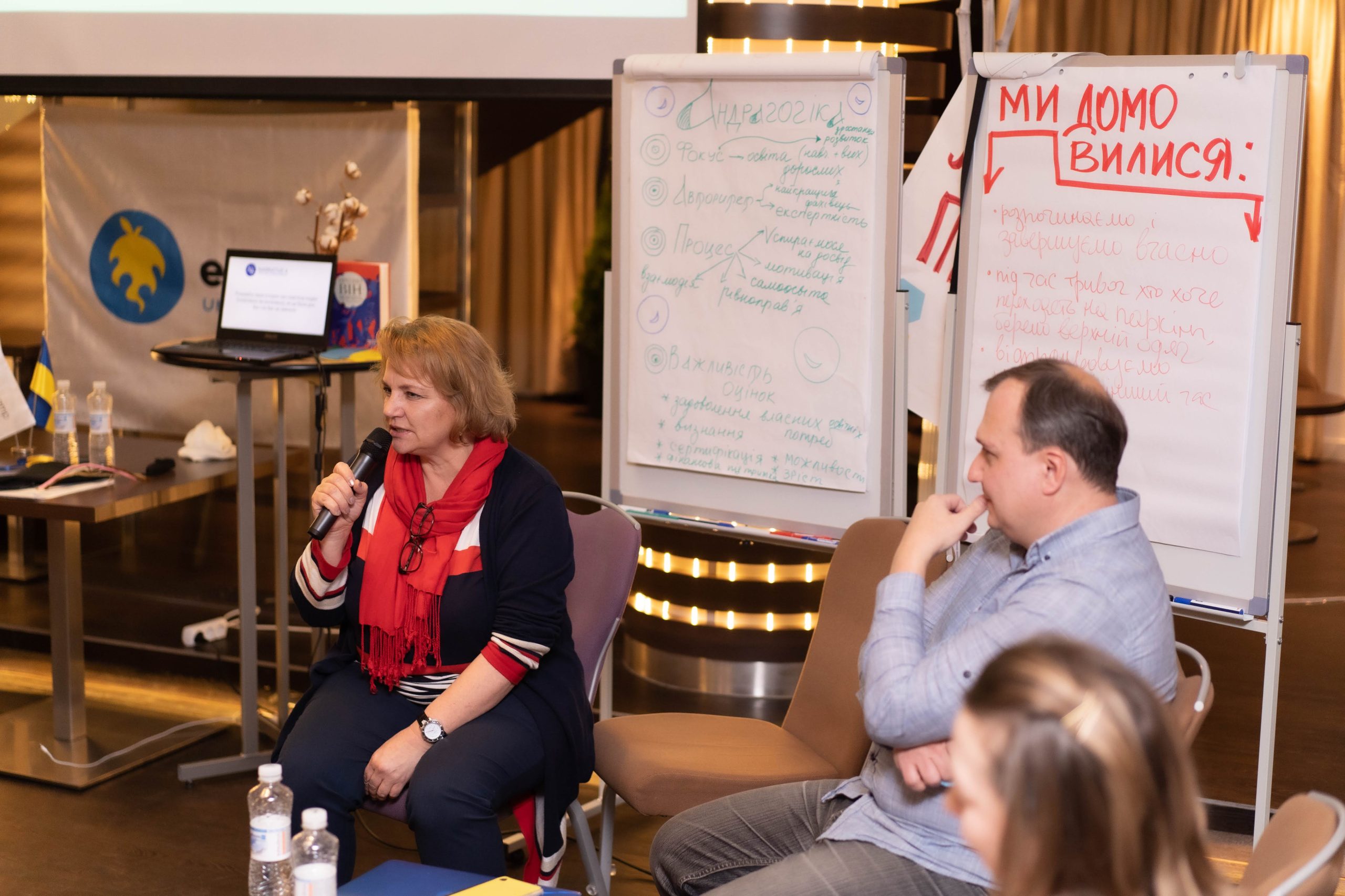 Учасники/-ці вивчали теорію і практику організації і проведення тренінгового навчання дорослих, опановували основні тренерські навички. Пані Олена поділилися тонкощами і секретами фісилітаторської й тренерської майстерності.